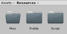 まずAssetsフォルダ内に"Resources"フォルダを作成し、Resourcesフォルダの中にも"Prefab"、"Script"、"Misc"フォルダを作成します。