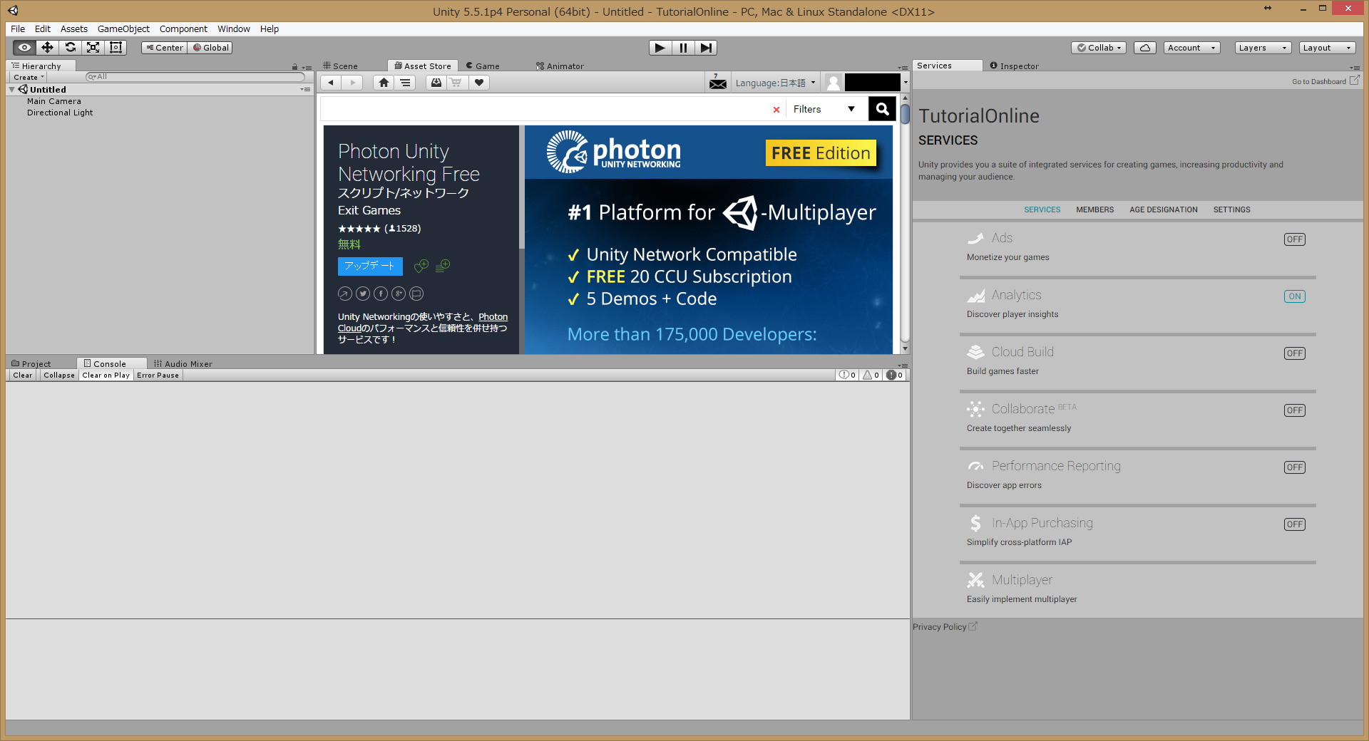 - Asset Storeの検索欄にPhoton Unity Networkingと入力し、検索します。