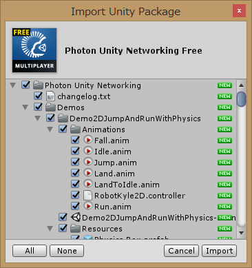 - Photon Unity Networking Free をダウンロードすると以下の画面が出るので、Importします。