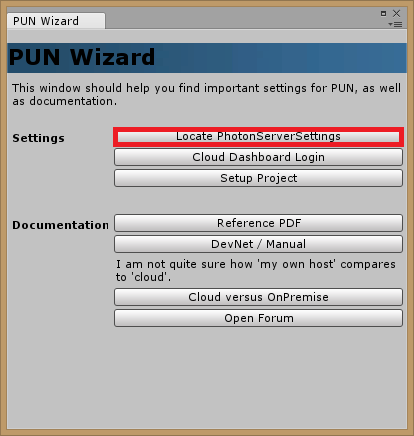 - 次に『Alt+P』を押すとPUN Wizard画面(以下の画面)が表示されるので『Locate PhotonServerSettings』をクリックします。