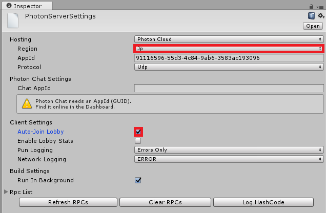 - InspectorビューにPhotonServerSettings画面が表示されるのでRegionをJpにし、Auto-Join Lobbyにチェックを入れます。